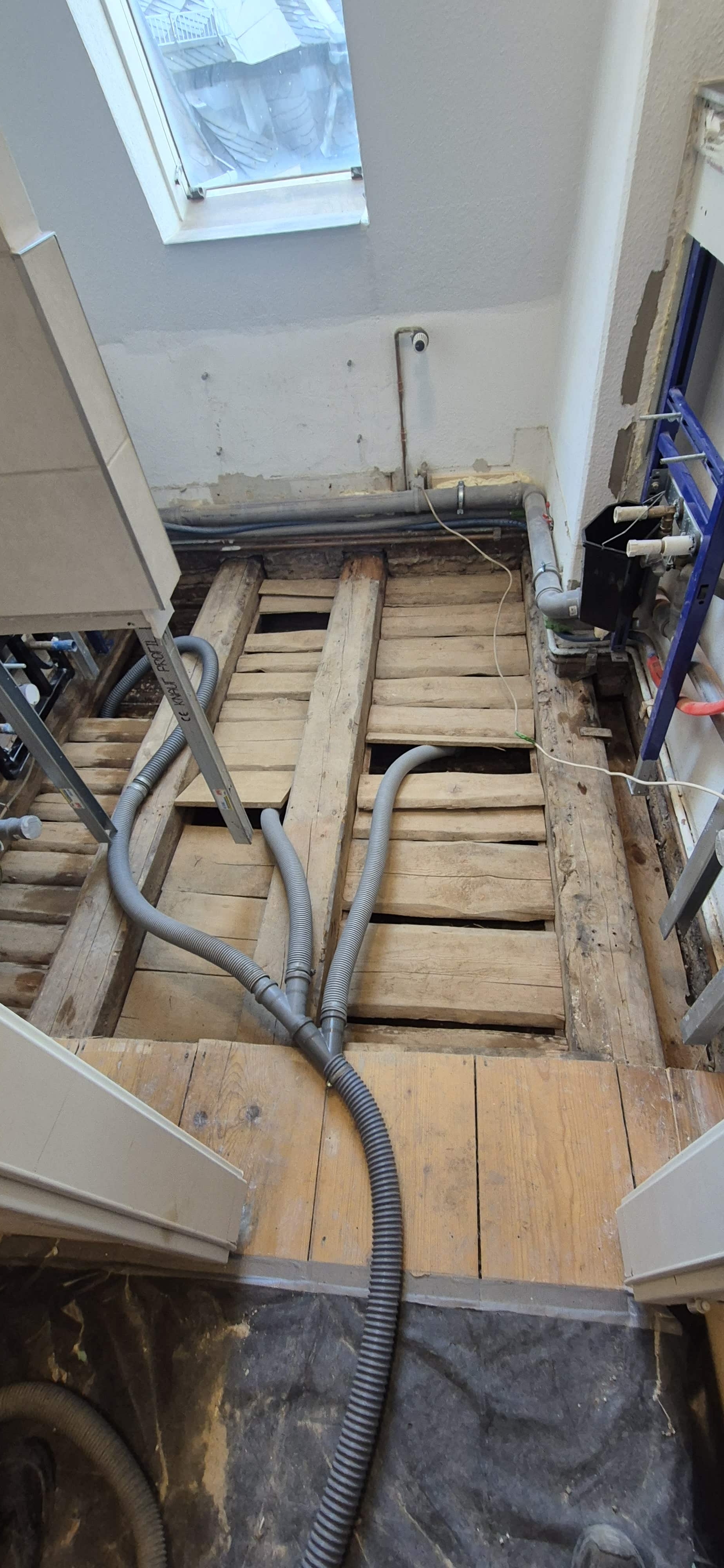- Großflächige Wasserschäden im Fußboden (Holzbalkendecke mit Sandauffüllung)